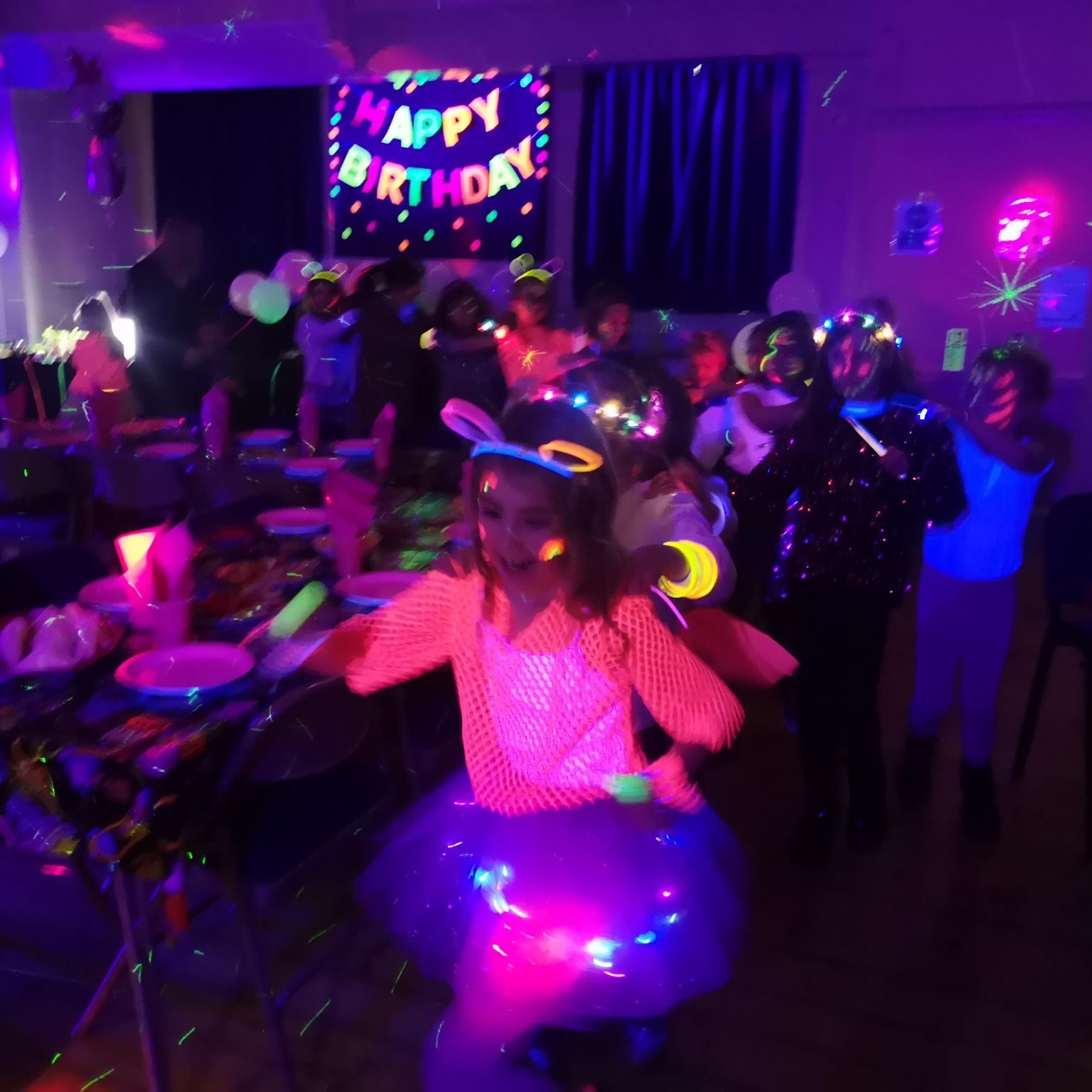 - For the first 15 – 20 minutes of the party the DJ will be playing whilst I will be doing very quick neon facepainting. The face painting is just spots and stripes so that the kids glow under the UV lights – so nothing intricate – just war paint!!.